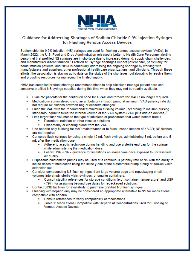 NHIA Guidance for Addressing Shortages of Sodium Chloride 0.9% Injection Syringes for Flushing Venous Access Devices