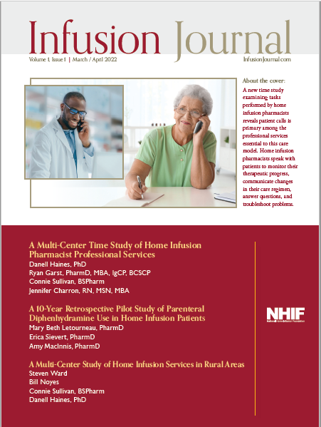NHIF believes there is sufficient scientific content to support Infusion Journal. Infusion providers have access to extensive data and unique context, but they lacked a journal to foster the orderly communication of the information. Illustrating the unmet need for a journal specifically focused on infusion therapy, the three studies in this first issue of Infusion Journal concentrated on research in home infusion. Two of the studies were multi-center and showed that home infusion research is being performed on local and national levels.