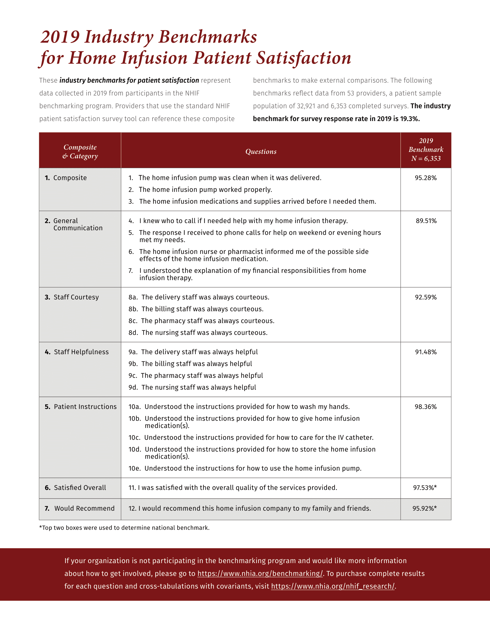 The primary aim of the Home Infusion Benchmarking Program, a National Home Infusion Foundation (NHIF) initiative, is to measure how patients perceive the performance of the home infusion industry. Benchmark data is vital to the continued growth of the home infusion industry because it involves translating subjective results into meaningful, quantifiable, and actionable data. At the provider level, system gaps can be determined, thus allowing for the development of an effective action plan for quality improvement. A critical voice in the success of health care is that of the patient. This voice is so critical, that measurement and reporting of patient satisfaction has been deemed a mandatory requirement for all Accountable Care Organization (ACOs) and Medicare providers. As a result, the patient satisfaction benchmarking program became a priority program for the NHIF.